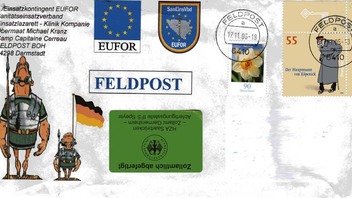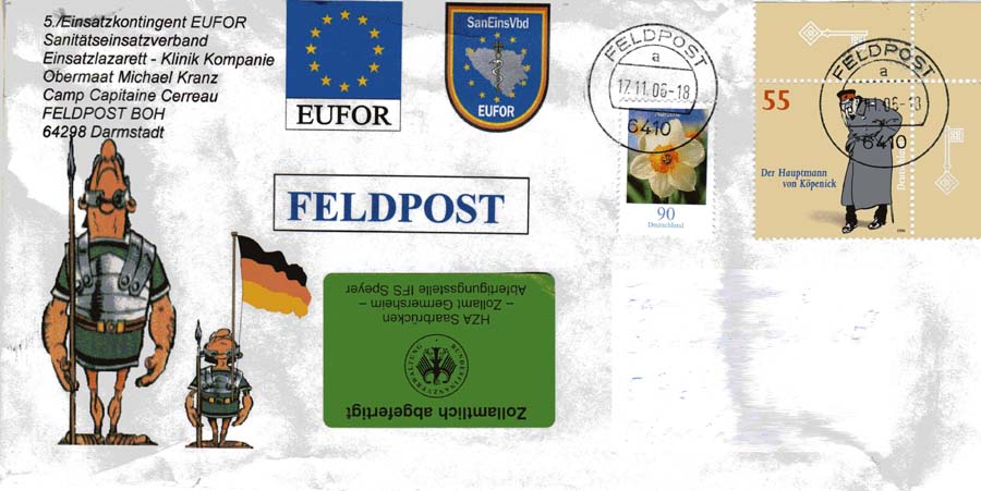 HGallo nun ein Feldpost Brief der als A4 Brief als Einschreiben mit Rückschein aus Rajlovac kam, der Brief trägt den WM Block und dann noch mehrere Rollenmarken, ein auch sehr schöner Beleg, der bei mir einen besonderen Platz hat weil dort mein Geburtstagsgeschenk drin war, wie man sieht wurde auch dieser Brief zollamtlich kontrolliert!