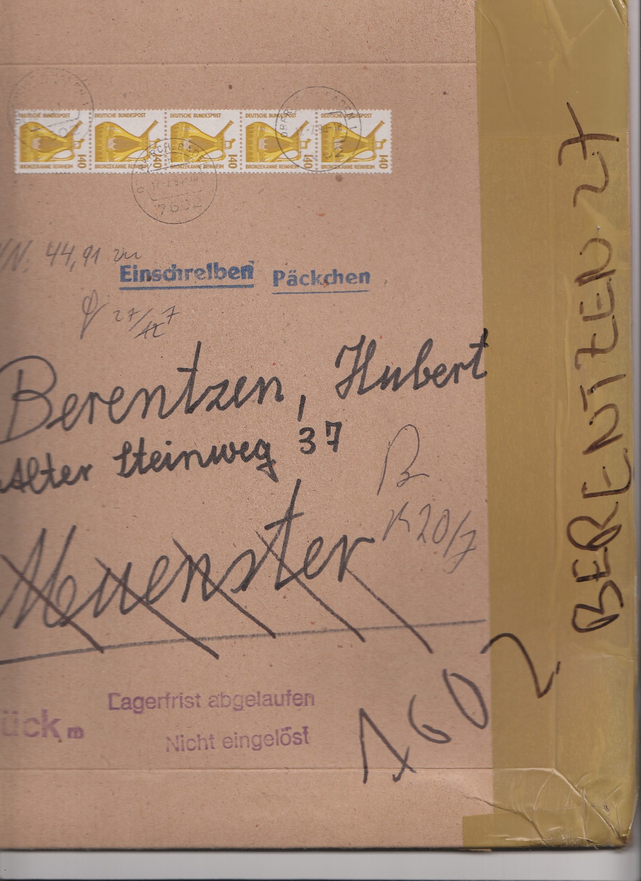 Es handelt sich um ein Päckchen, Postgebühr 350 Pf, per Einschreiben, Postgebühr 250 Pf und Nachnahme, Postgebühr 200 Pf.
