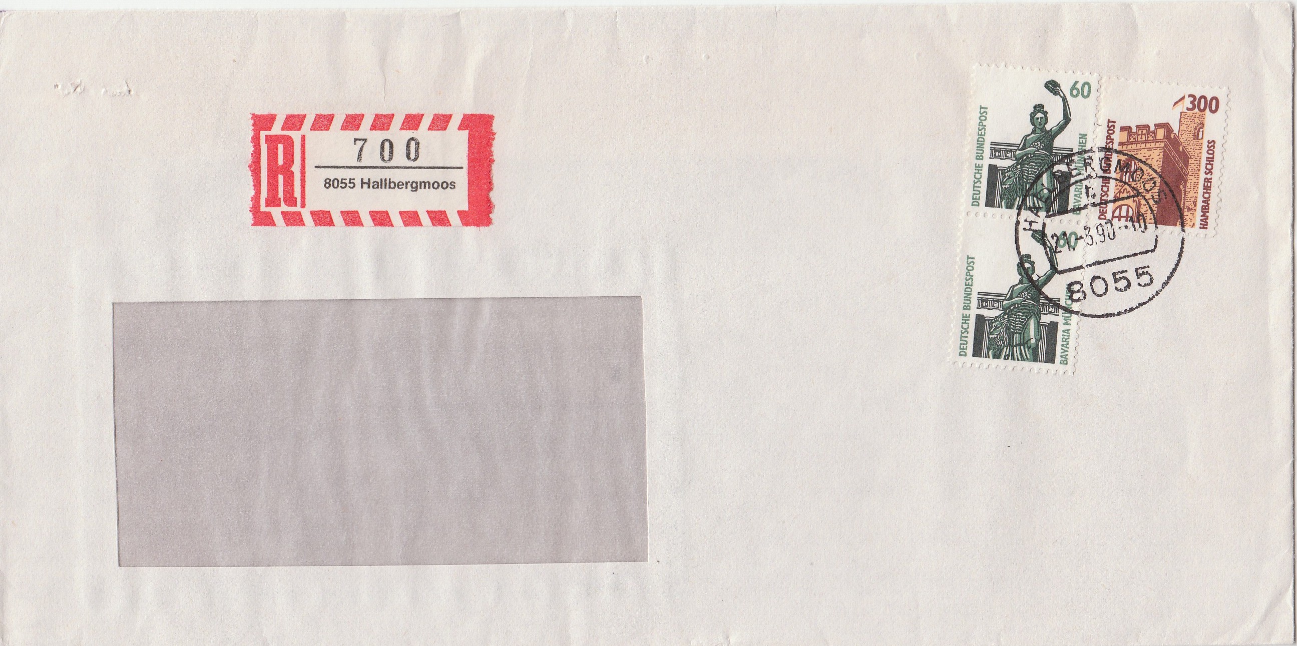 Brief per Einschreiben mit einem 3er-Streifen des 90 Pf Wertes B+S plus Zusatzfrankatur SWK als Rollenende, freigemacht mit 440 Pf.