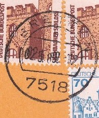 Die resultierende Portostufe von 670 Pf wurde dargestellt mit zwei 300 Pf Werten SWK sowie einem 70 Pf Wert B+S.