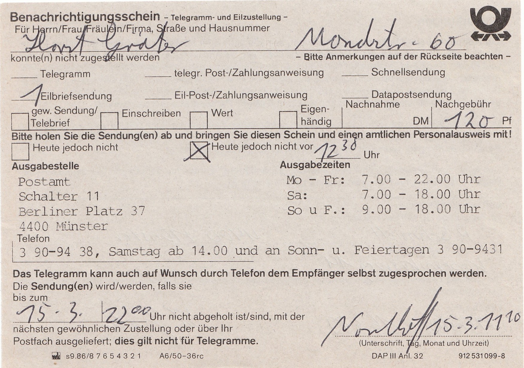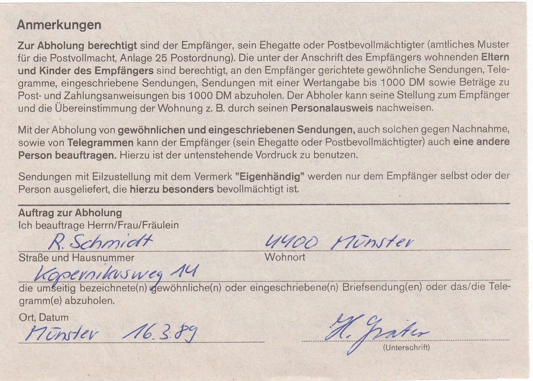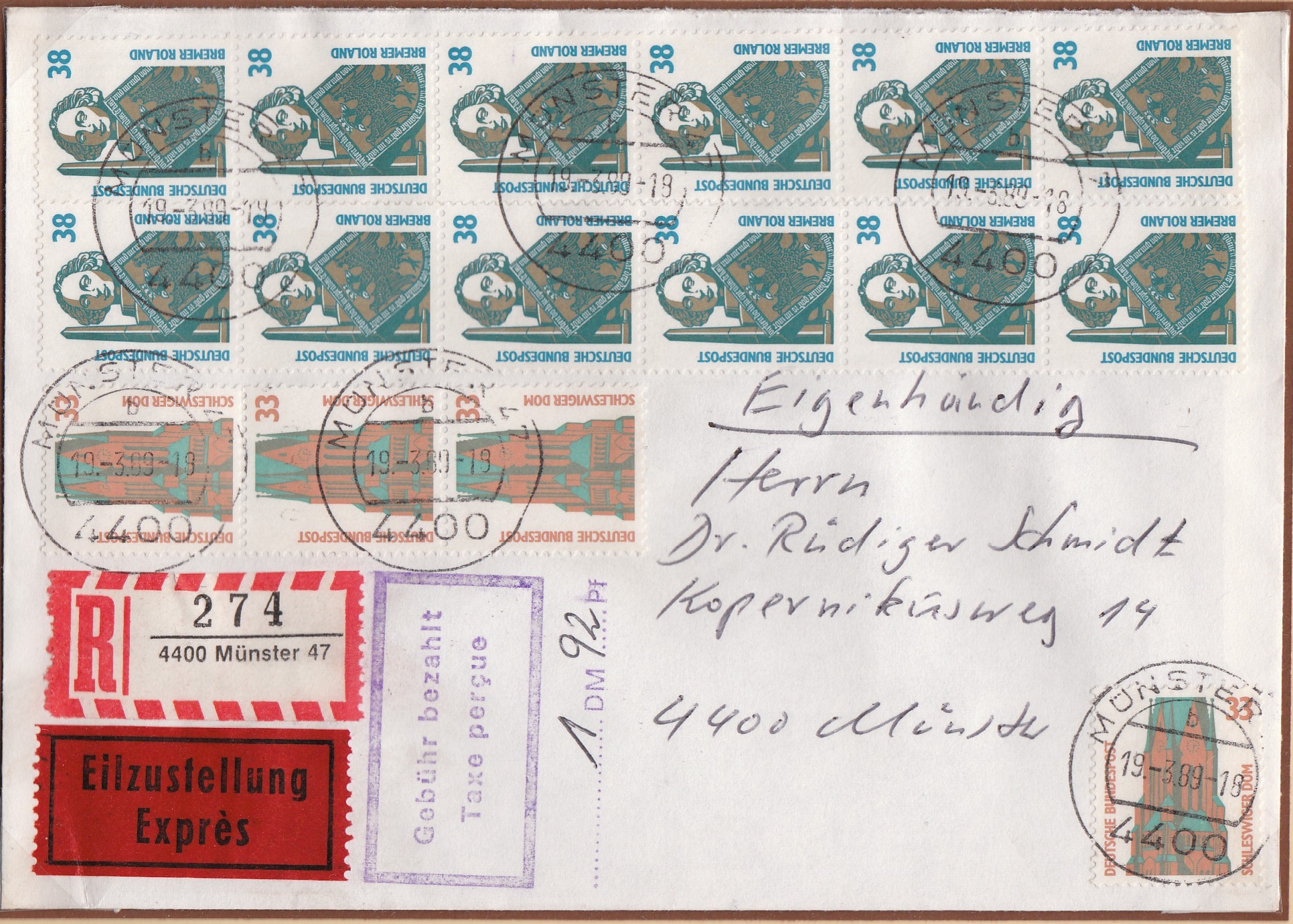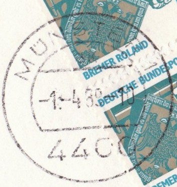 Hier mit Tagesstempel Münster vom 1.4.89 als Ersttag dieser Portostufe eine Postkarte (Postgebühr 60 Pf) per Eilzustellung (500 Pf statt zuvor 350 Pf).