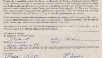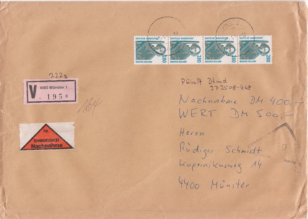Als Zusatzdienste wurden in Anspruch genommen: Wertangabe bis 500 DM, Postgebühr 500 Pf (statt vorher 350 Pf) sowie Nachnahme in Höhe von hier 400 DM, Postgebühr 200 Pf (statt vorher 170 Pf).