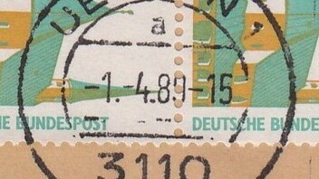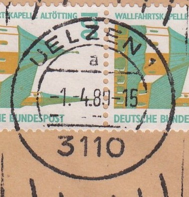 Die Entwertung erfolgte mit Handrollstempel am 1.4.89 in Uelzen.
