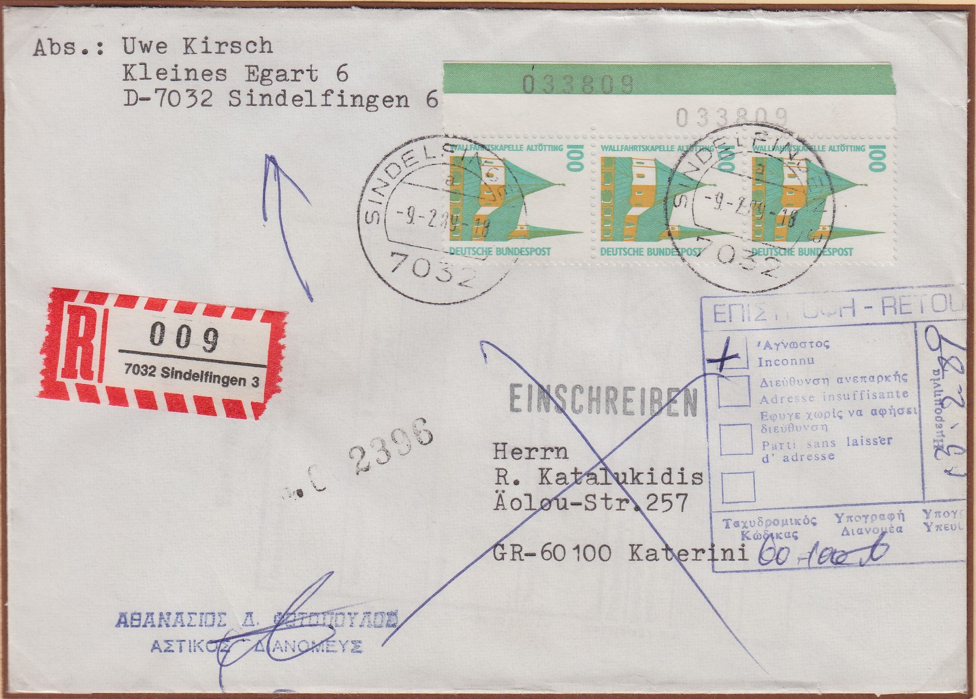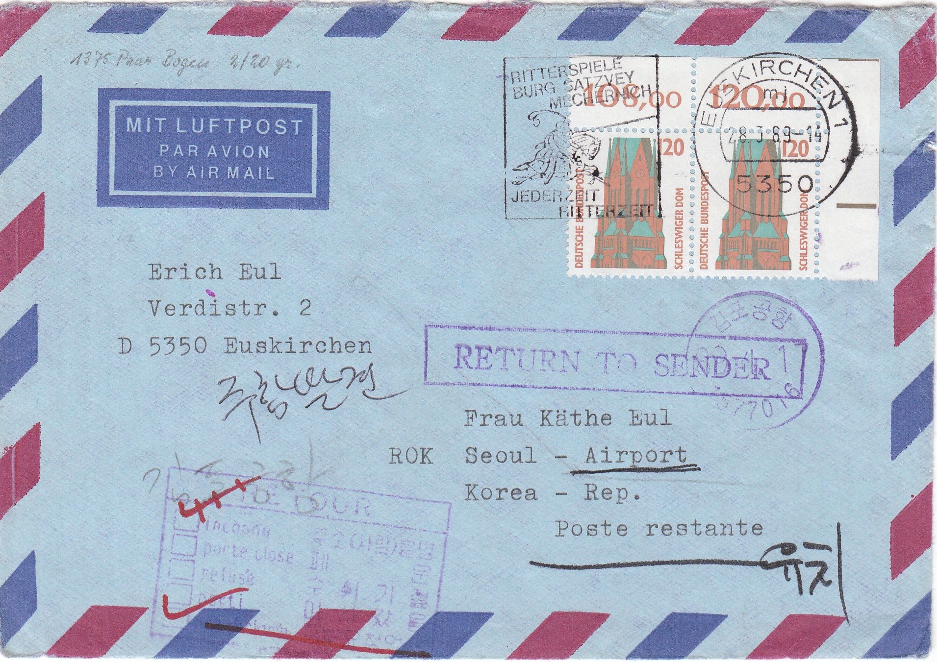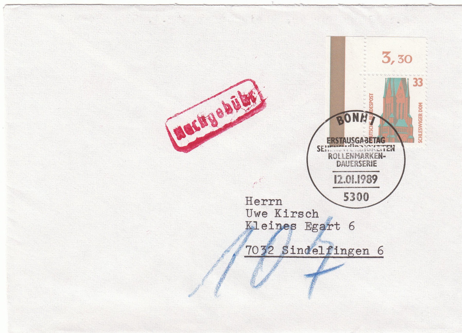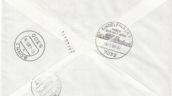 Per rückseitig angebrachten Stempeln wurde dieser Brief am 17.1.89 in Bonn aufgegeben, um den Ersttagsstempel zu belegen, und wurde dann am 18.1.89 in Sindelfingen zugestellt.