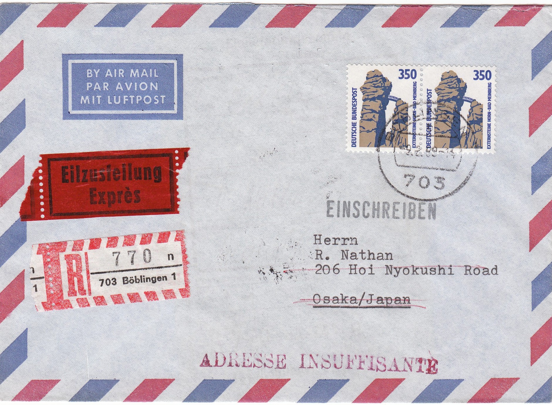 Zuerst ein Brief der zweiten Gewichtsstufe von 20 bis 50 g (Portogebühr 130 Pf) per Eilzustellung (Portogebühr 350 Pf), die Portostufe 480 Pf ergebend.