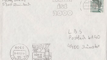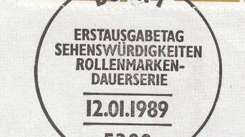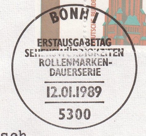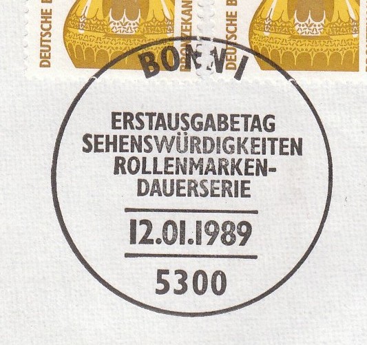In Bonn wurde dieser Fehler bemerkt und das verklebte Postwertzeichen wurde per Maschinen-Werbestempel "Bonn ist 2000" am 1.2.89 um 21 Uhr entwertet.