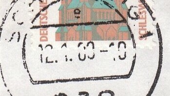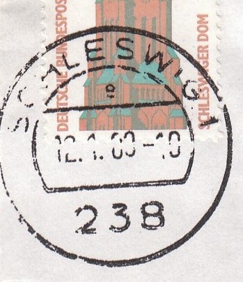 Als zweiter Beleg aus dem Januar 1989 hier eine reine Mischfrankatur der "krummen" Werte 33 Pf sowie 38 Pf der Dauerserie SWK, gestempelt am Ersttag, dem 12.01.89 in Schleswig als dem des Motivs des 33 ÖPf Wertes entsprechender Aufgabeort.