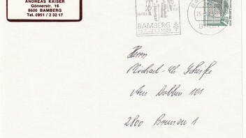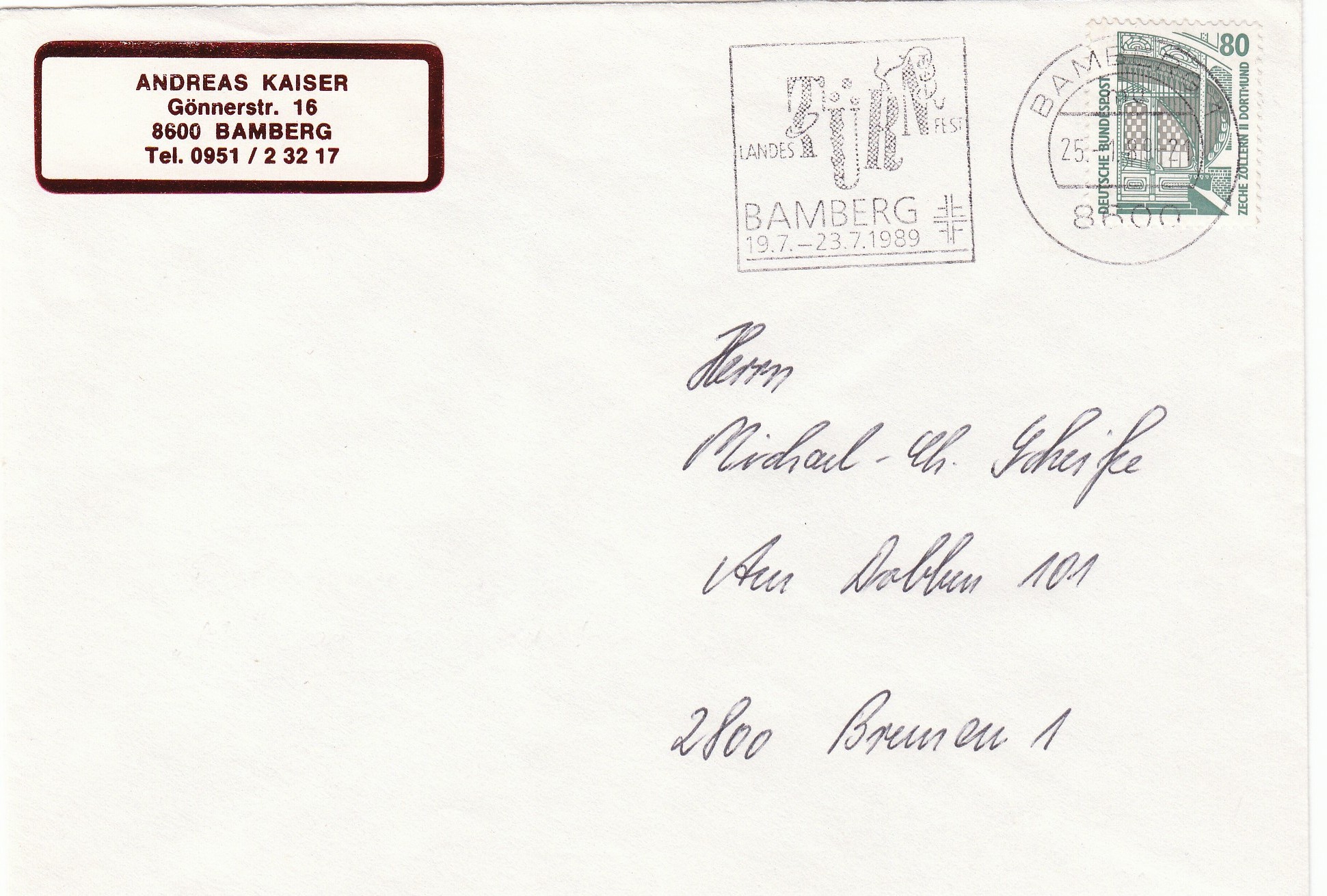 Hier ein Standardbrief, portogerecht mit Einzelfrankatur 80 Pf SWK, entwertet mit Maschinenstempel Bamberg 25.1.89.
