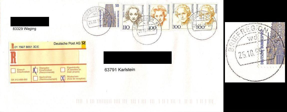 Gelaufen von 83329 Waging nach 63791 Karlstein, entwertet mit dem Handstempel Briefregion 83 am 25.10.1999