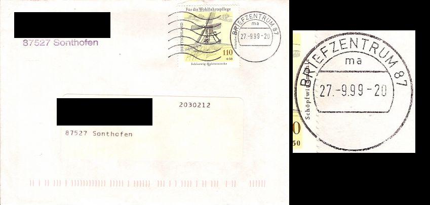 Auch die schönste Serie hat einmal ihr Ende. Weiter geht es mit einem Wellenstempel vom Briefzentrum 87 vom 27.09.1999, aber immerhin eine Zuschalgmarke (Anhang links).