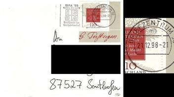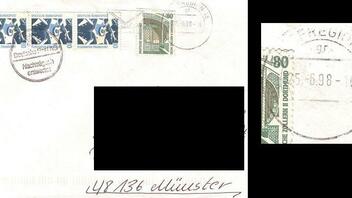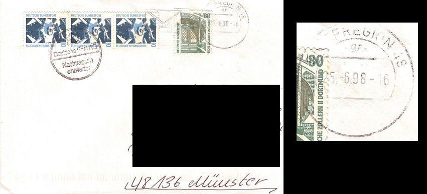 Der Maschinenstempel hat aber nur den Bogenrad und nicht die Marke getroffen. Dies wurde in Münster erkannt und die Marke mit dem nachträglich entwertet Stempel am 11.09.1998 abgestempelt.