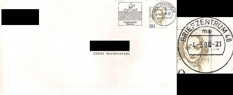 Ein Standardbrief mit einem Stempel vom Briefzenturm 48 vom 04.03.1998