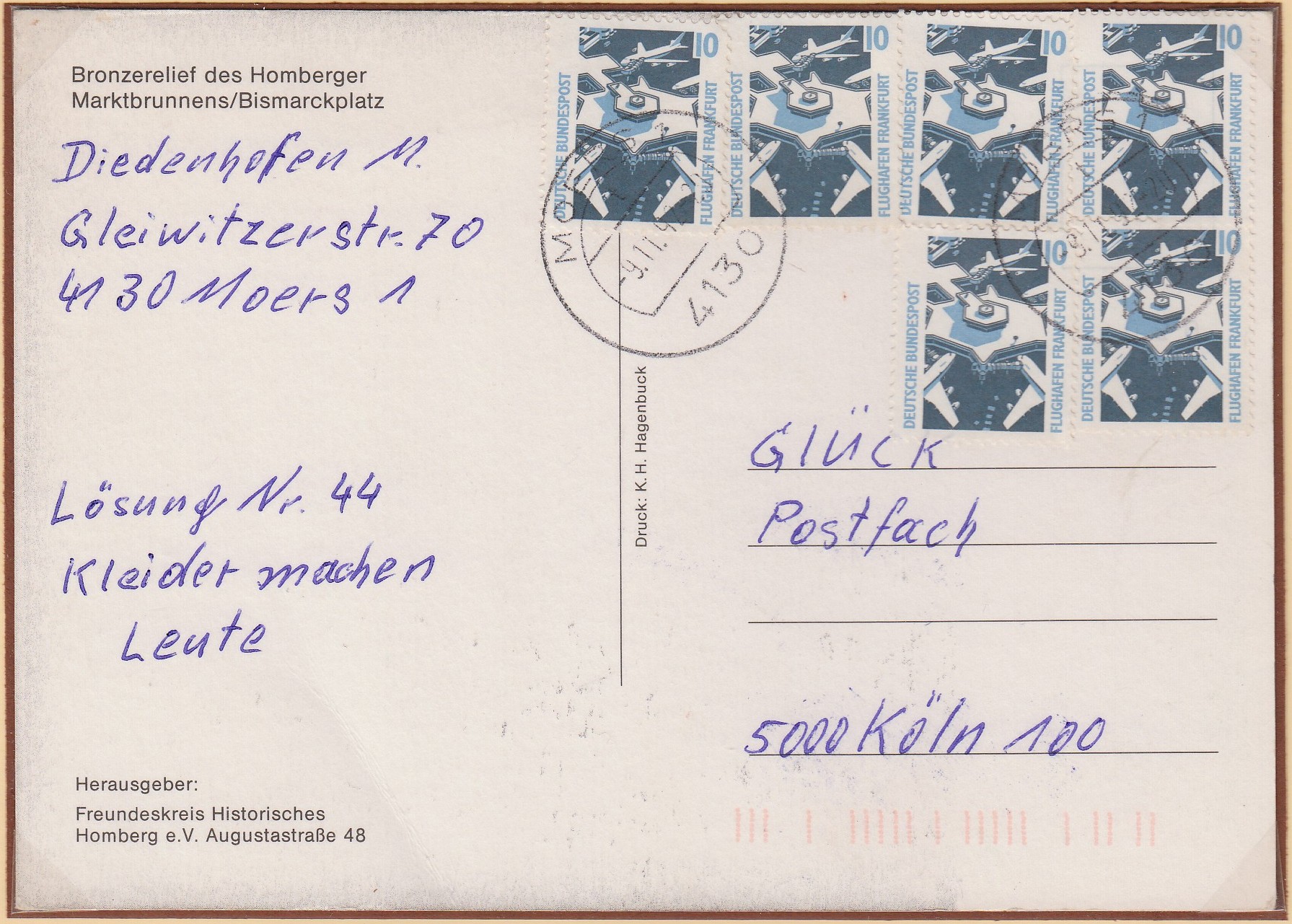 Als Frankatur hier eine Mischfrankatur der Freimarkenserie Sehenswürdigkeiten bestehend aus 80 Pf Wert sowie 20 Pf Wert.