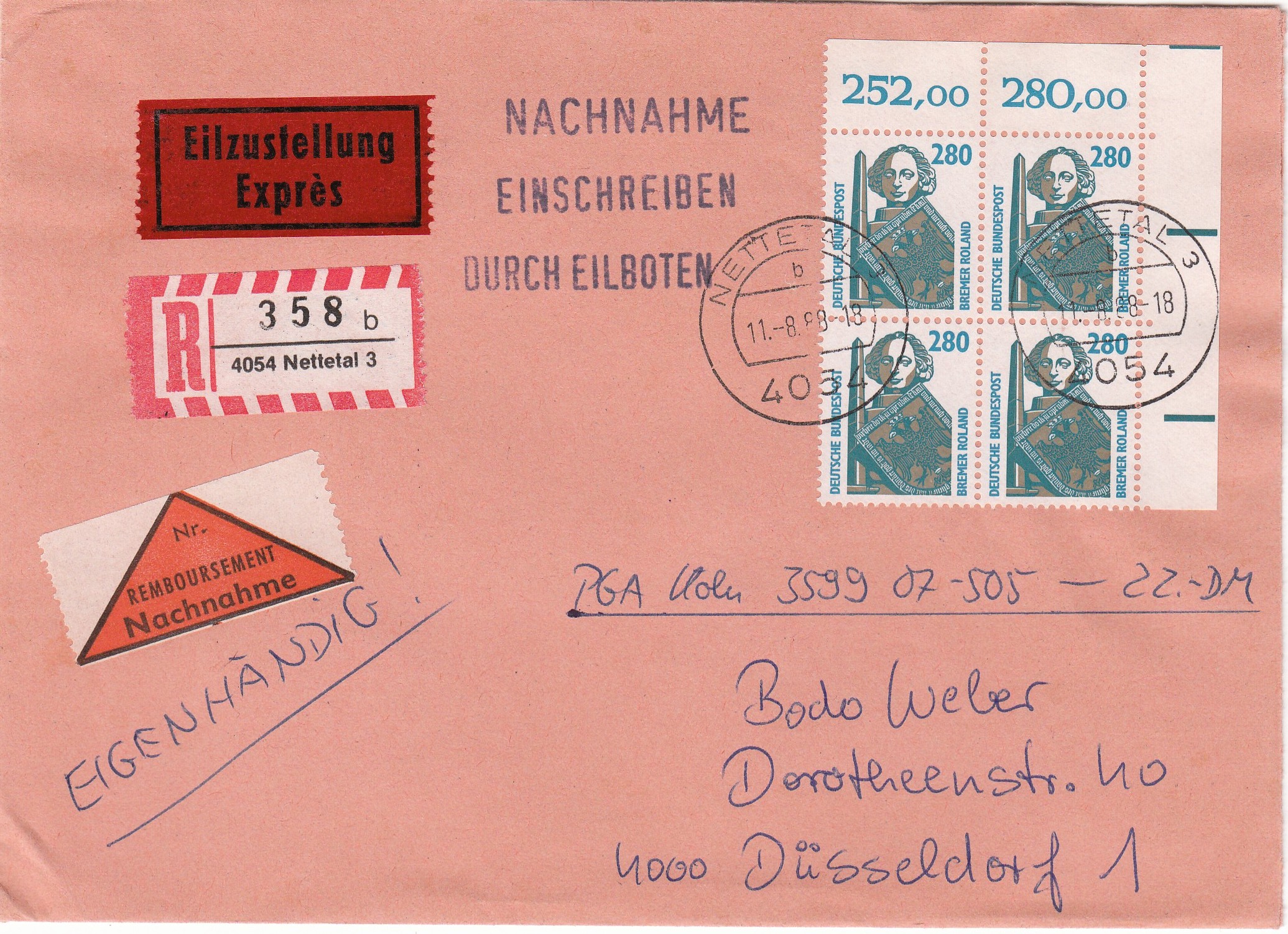 Frankiert wurde mit einem Viererblock aus der linken oberen Bogenecke des 120 Pf Wertes der Dauerserie SWK.