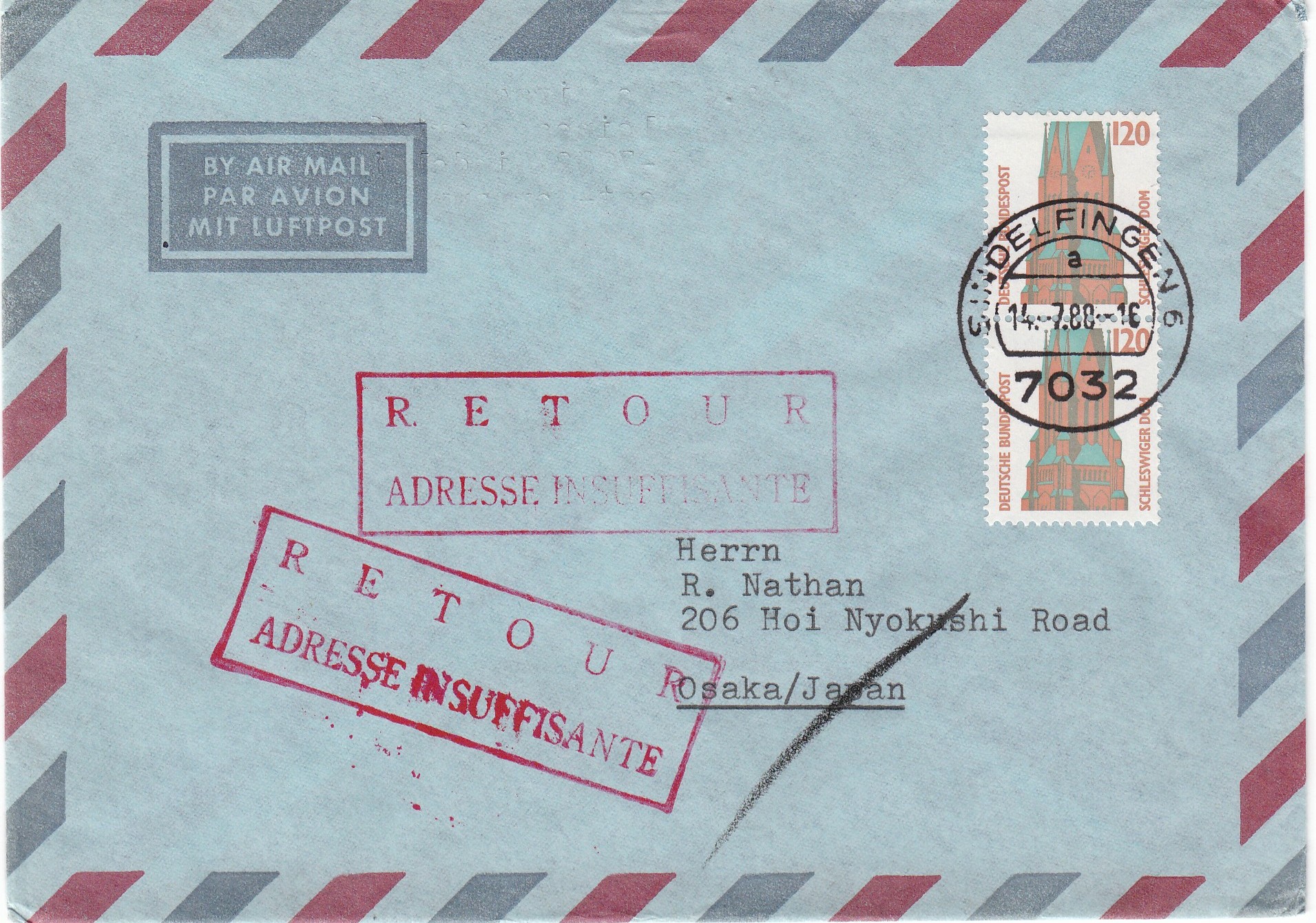 Brief nach Japan per Luftpost, Portostufe 240 Pf, wovon 120 Pf die Postgebühr für einen Brief ins Ausland darstellen und 120 Pf die Luftpostgebühr, entwertet mit Tagesstempel am 14.7.88.