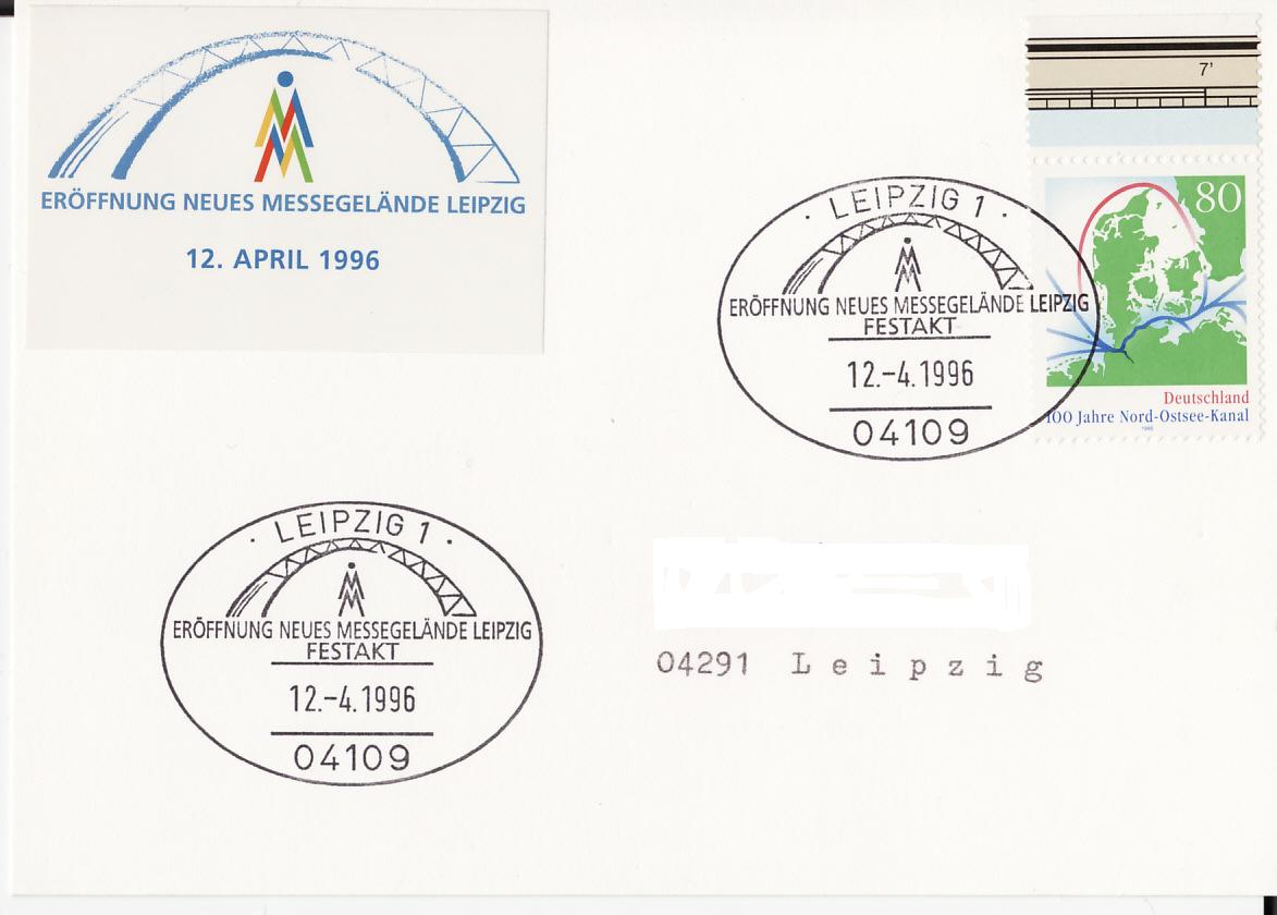 Eine Karte mit Sonderstempel vom 12.04.1996 zur Eröffnung des neuen Messegeländes in Leipzig.