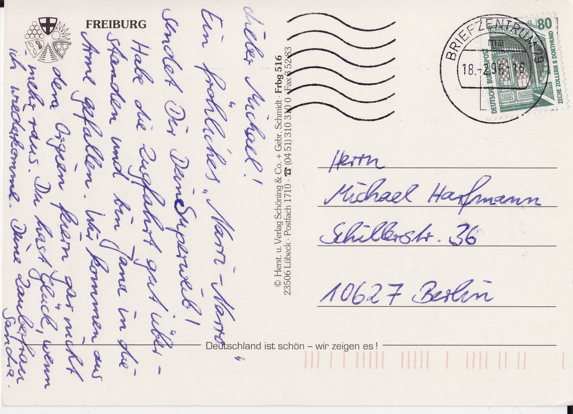 Ich hab endlich Februar 1996 gefunden. Eine Karte aus Freiburg im Breisgau.
