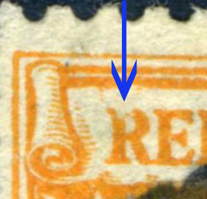 Der zweite im Michelkatalog aufgeführte Plattenfehler ist das "I" in Reichspost, das oben gespalten ist.