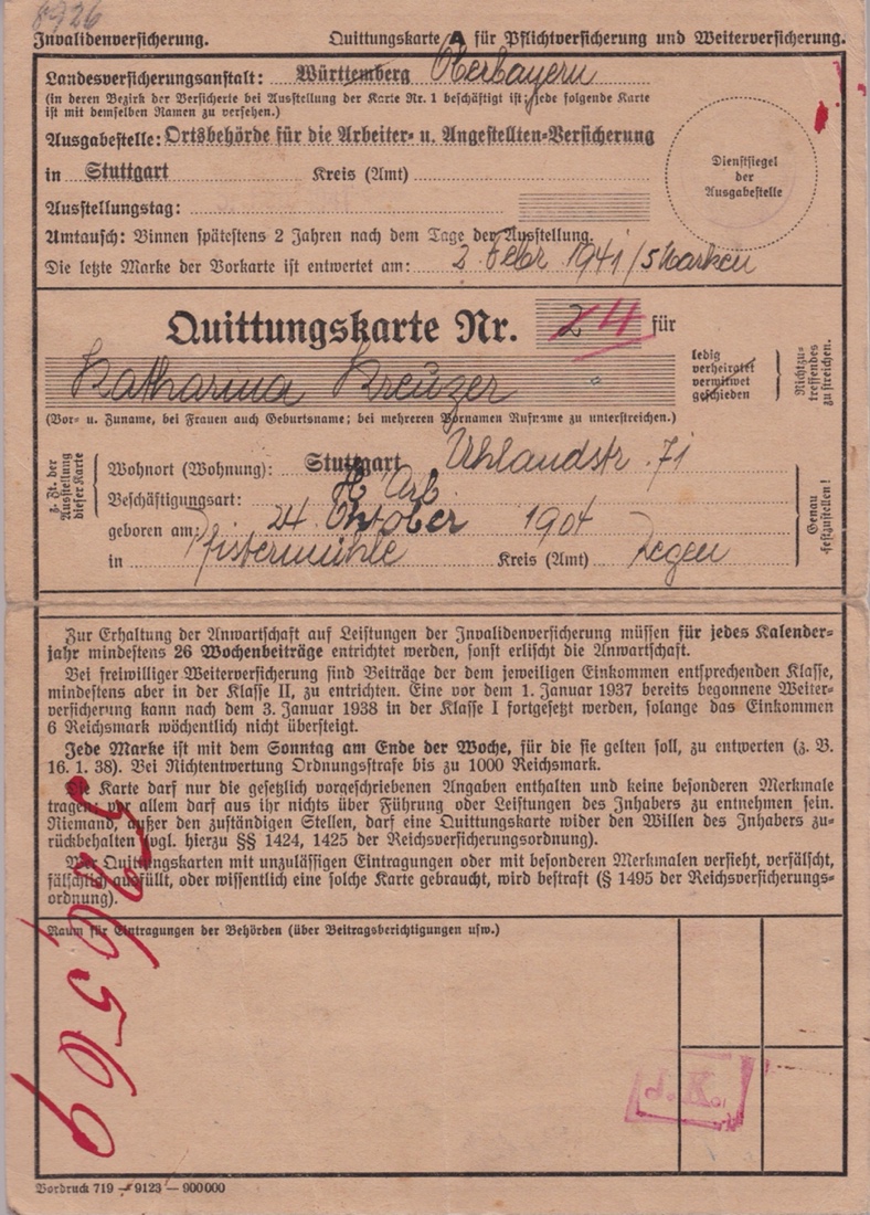 ich verschenke eine Sammlung von 21 Quittungskarten zur Pflichtversicherung mit Fiskalmarken.