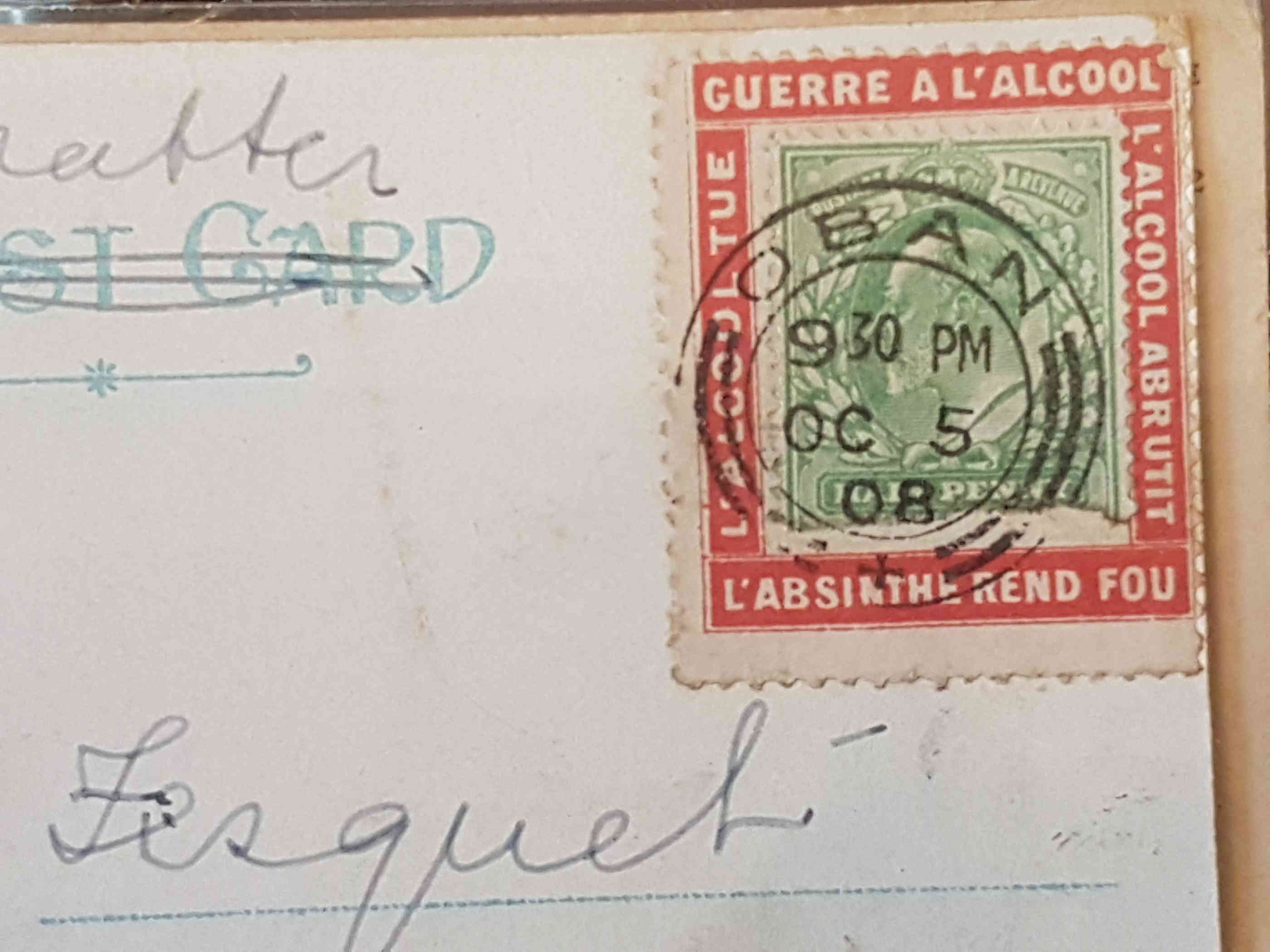 Was kartenhai zum Absinth zeigt, ist ein französischer sogenannter « porte-timbre », ein Briefmarkenträger, gedacht um die Briefmarke zu umranden. (googlen : timbre guerre à l’alcool). Die Besonderheit hier ist die Nutzung in Schottland (es ist nicht die Abbildung einer britischen Marke, sondern eine echte und gelaufene Briefmarke). Absinth war eher in Frankreich ein Problem, obwohl es auch in Grossbritannien starke Bewegungen gegen den Alkoholmissbrauch gab.
