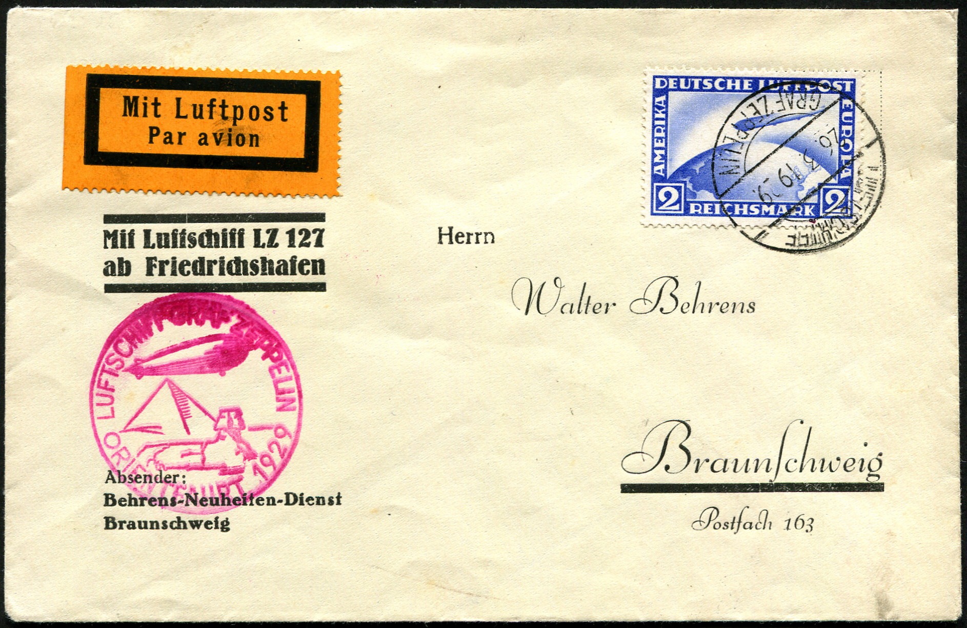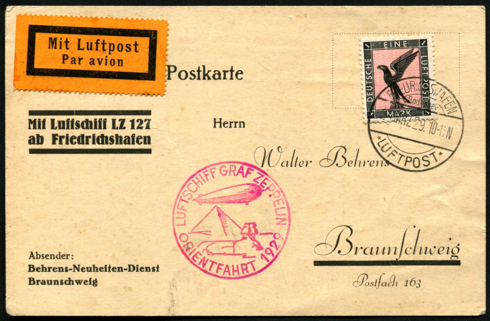 Beleg von der Orientfahrt im März 1929 in Form einer Postkarte des bekannten Briefmarkenhändlers Behrens aus Braunschweig. Von diesem Händler sind seinerzeit eine ganze Reihe Zeppelinfahrten mit Belegen dokumentiert worden.