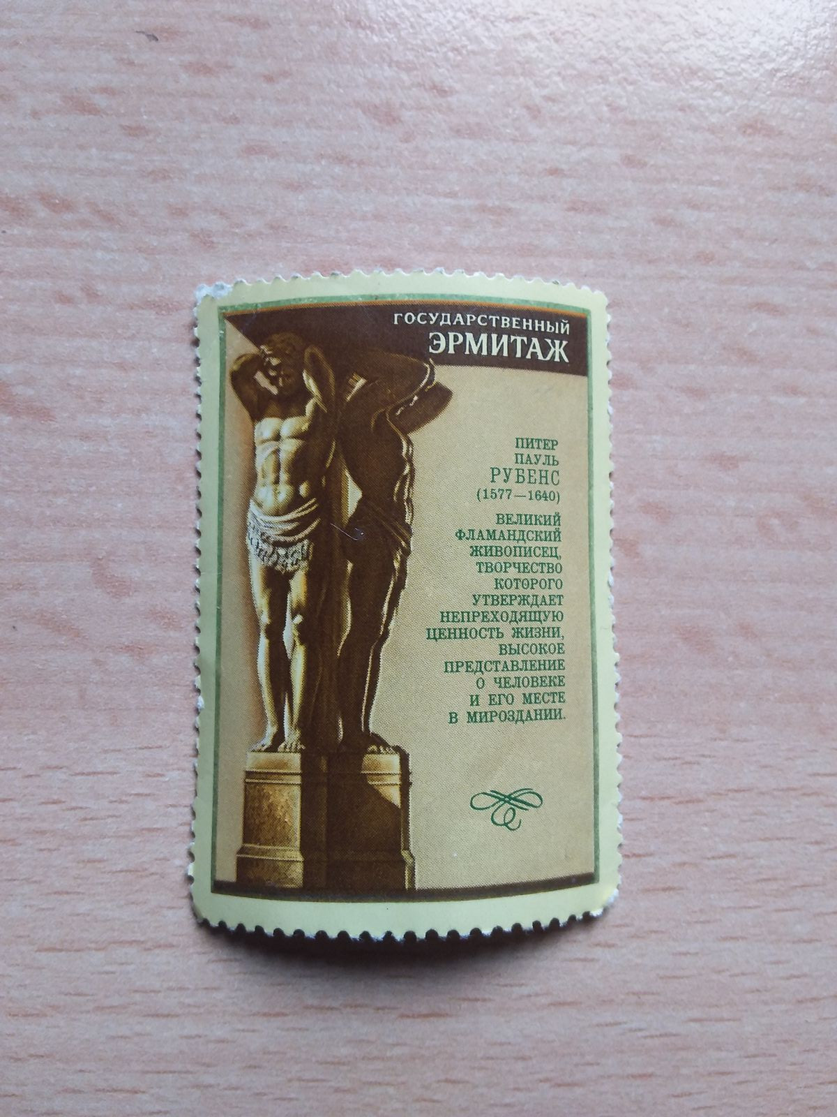 Das ist ein Neben- oder Zwischenfeld, was mal an einer Briefmarke dran hing. Ich habe mal schnell im Katalog nachgeschaut: es gehört zu einer sowjetischen 12-Kopeken-Marke vom 24. Juni 1977, auf der ein Gemälde (Bündnis der Erde mit dem Wasser) von Rubens abgebildet ist. Allein sind solche Felder ohne besonderes Interesse, etwas abgegrabbelt ist es auch schon, vielleicht war es ein Reiseandenken?