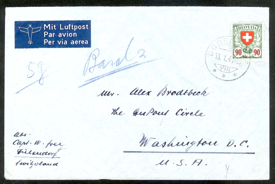 Von Dübendorf (meiner Nachbar-Gemeinde) nach Washington. D.C. mit einer auch recht seltenen Frankatur.