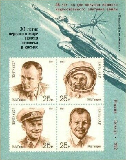Block 218 der Sowjetunion, aber mit Aufdrucken die sich stören. CCCP auf den Marken, Rossija auf dem Block, und das 1992 ? Der erste Text für 30 Jahre (seit Gagarin), der zweite rote für 35 Jahre ?