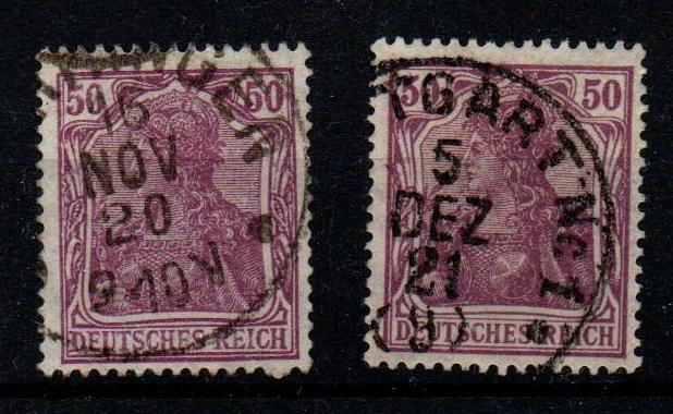 Bei der 50 Pfg. (Mi. 146) bin ich mir relativ sicher, dass die linke Marke Platte I ist. Sowohl Ziffern als auch Mittelstück sind nach links verschoben. Ich stell hier mal meine (geprüften) Mi. 146 I und II zum Vergleich ein.