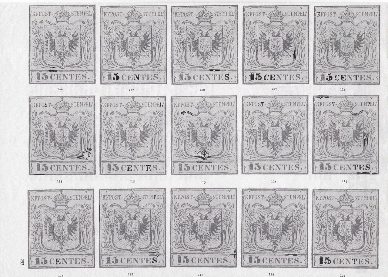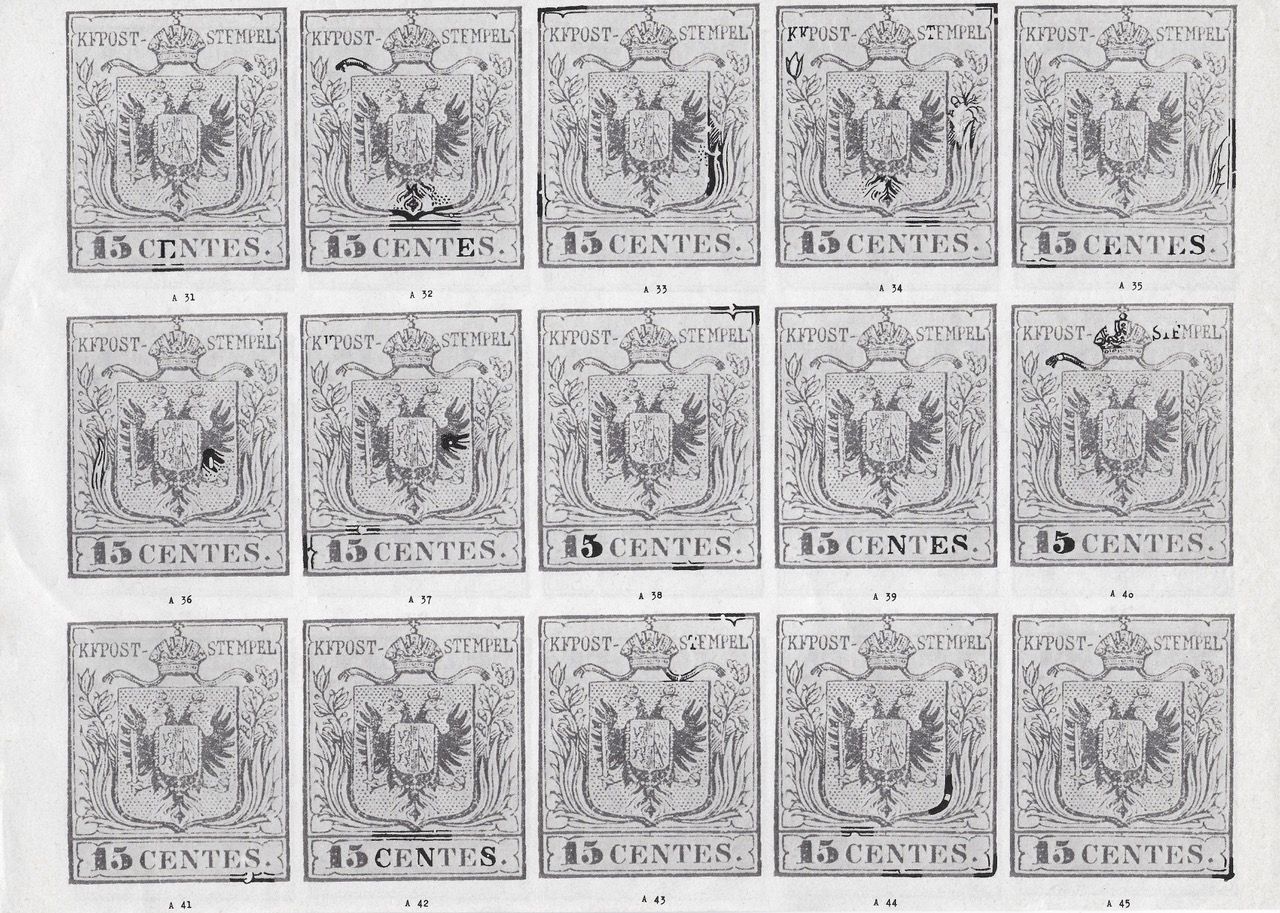 Hinsichtlich dieser Platten hat schon P.F. de Frank (1) richtig vermutet, dass die Typen der 15 Centesimi in zwei verschiedenen Platten vorkommen. Durch jahrelanger Zusammenarbeit vieler Sammler insbesondere den Herren F. de Hoffmann und C. J. Robertson ist es P. F. v. Stritzl (1898 - 1990) (2) gelungen wichtige Erkenntnisse zur Plattenforschung zu gewinnen, welche er in den 1970er und 1980er Jahren vereinzelt in diversen Fachartikeln veröffentlich hat.