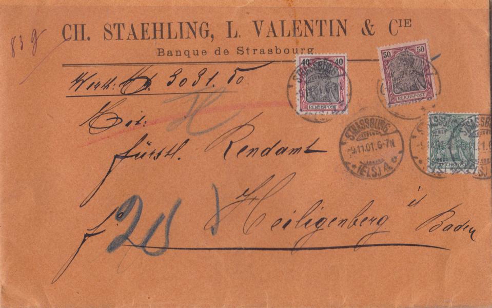 Einen Wertbrief von Straßburg im Elsaß an das fürstliche Rendamt in Heiligenberg in Baden, abgestempelt am 9.11.1901.