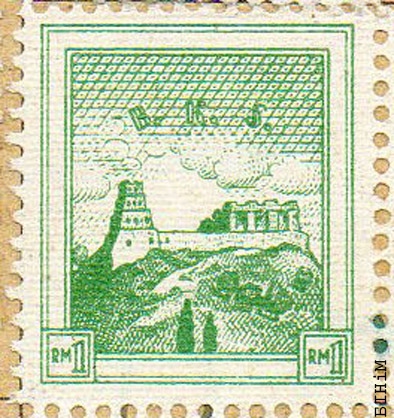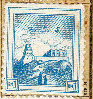 Marke mit dem Bild der Burg Vilnius. 1942 vom belarussischen Selbsthilfekomitee in Berlin herausgegeben. Initiator der Veröffentlichung ist Mikola Abramchyk. Künstler Zenan Zyankevich. Die Marke hatte Optionen von Rot, Grün und Blau. Stückelung - 1 Reichsmark. Die Marken wurden verwendet, um Mitgliedsbeiträge zu zahlen und Spenden auszuwerten.