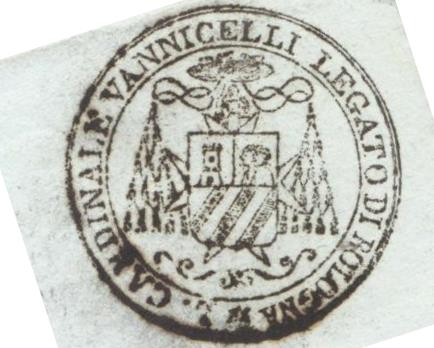 Vannicelli is the name, Cardinal is in the Catholic church the highest rank below the Pope. Legato di Bologna means Representative (Envoy) of the pope in Bologna, a town in Italy. Vannicelli held this position from 1844 til 1846.