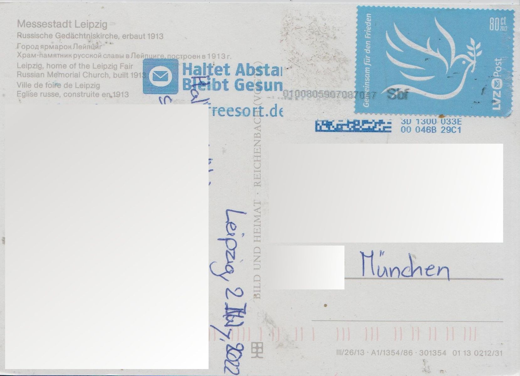 Eine Postkarte habe ich an mich in München versandt, diese wurde wie so üblich mit einem Label überklebt und dieses Label bedruckt. Ich habe dieses Label entfernt