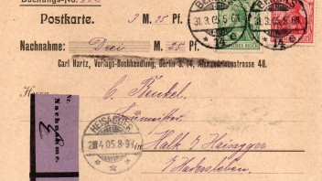 Ich zeige heute eine Drucksachenkarte mit Nachnahme aus Elmshorn an die Magerinefabrik in Bröns. 3 Pfennig Drucksachenporto und 10 Pfennig Nachnahmegebühr. So liebe ich Mischfrankaturen.
