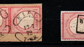 Diesmal zeige ich eine Marke auf Briefstück mit nachverwendetem TH&T-Stempel Hersfeld, ein senkrechtes Paar auf Briefstück mit dem Kieler Wurststempel (unterer Bogen oben offen, die billigere Variante) und einen senkrechten Dreierstreifen auf Briefstück mit dem nachverwendeten Preußen-Stempel Wüste-Waltersdorf.