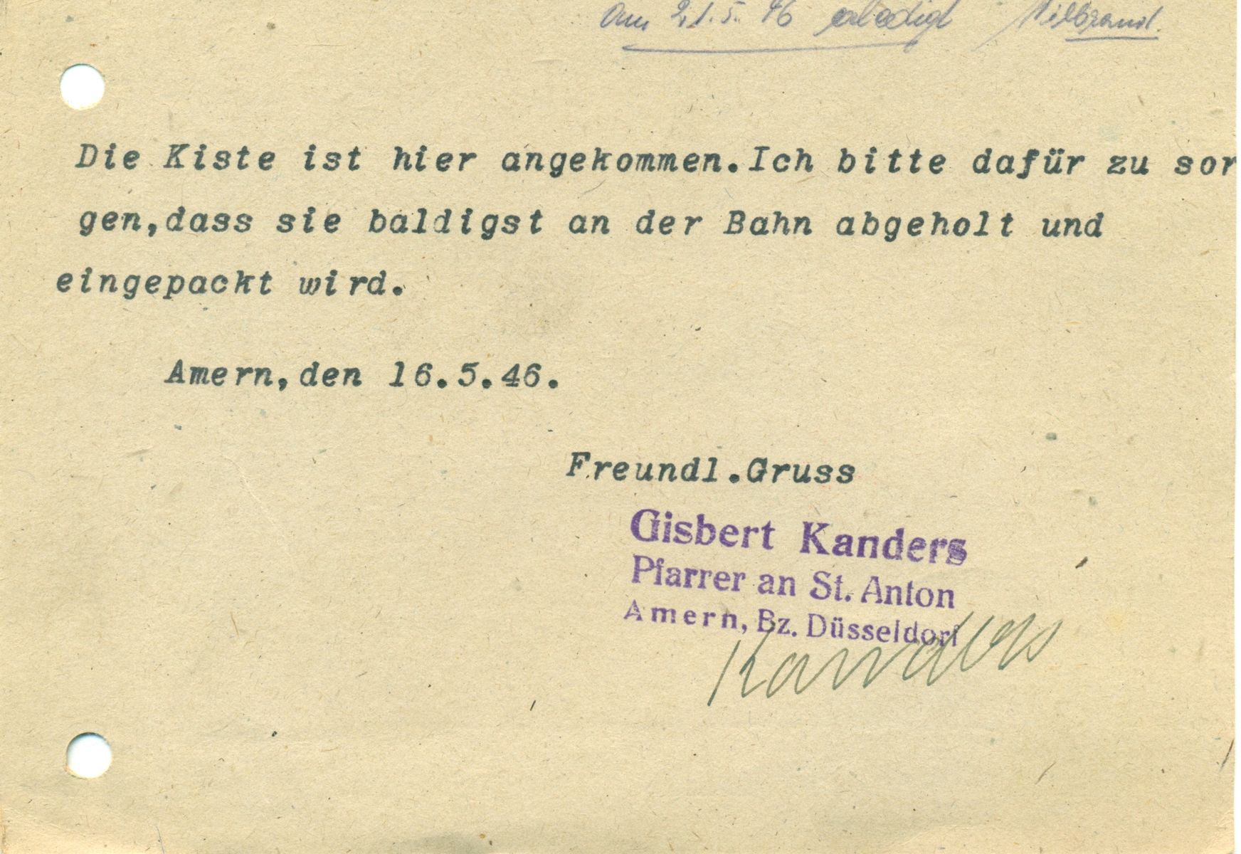 Angefangen mit zwei Belege an einen Orgelbauer in Aachen in der Nachkriegszeit. Wo relevant Vorder- und Rückseite.