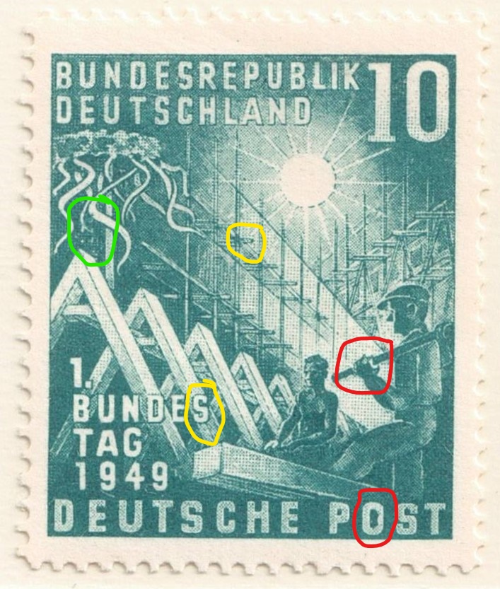 Die Bund 111 aus Beitrag 330 passt aber auch hervorragend zu den gezeigten mit weißem Punkt oben an Faust rechter Arbeiter mit innen defekten O von POST.