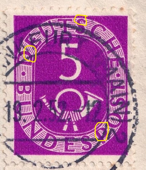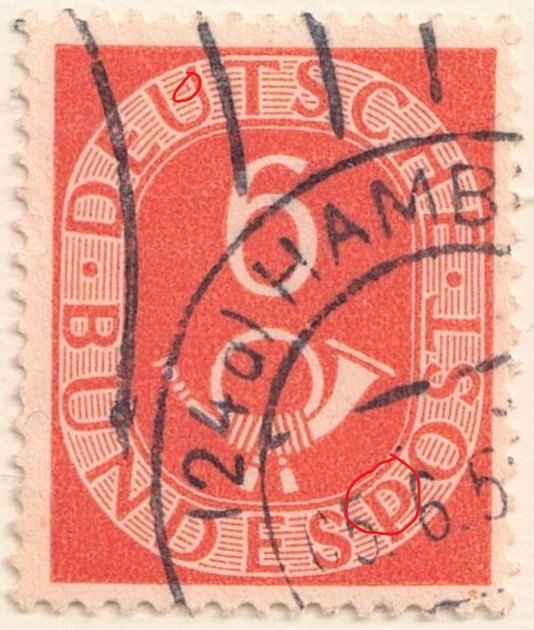 Wäre unwahrscheinlich wäre das doch nicht, daß dieses insbesondere bei der unter Zeitdruck und (!) Materialunwägbarkeiten hergestellten ersten Tranche (4-10-20 Pfg.) in Höhe von rund 8 Mrd. zum Stichtag 20. Juni 1951, nicht auch mal passiert ist. Die 20Pfg. hatte lt. W. Maaßen [Die Posthornserie] davon einen Anteil in Höhe von 2,5 Mrd. Stück. Insgesamt waren das Zusammen ja schon 4/5 der im Buchdruck hergestellten Menge vom Posthornsatz.