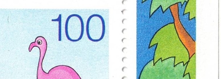 Der Farbdruck (besonders rosa Flamingo sowie seitliche Schriftzüge) des linken Block 24 erscheint insgesamt schwächer.