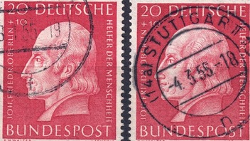 EDIT: Suche gerade meinen Stechzirkel um mal die Außenmaße der jeweiligen Marke abzugreifen und abzugleichen. Steht das Bild der linken Marke, etwas gekippt zur Zähnung? Ist die rechte Marke eingelaufen / die linke Marke gestreckt?Rätselnde Grüße