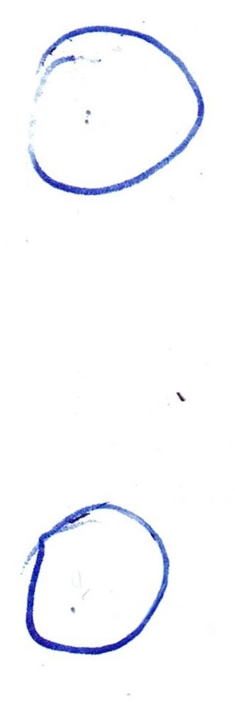 Blauer Haken auf rechtem Nasenflügel sowie senkrechtem blauen Strich mittig Nase unten.Hier das eingedellte O