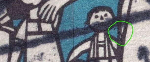 Der dicke / breite schwarze Strich in der schwarzen linken Linienzeichnung wäre für eine 08/15-Putze in meinen Augen, schon etwas ungewöhnlich. Die 3 einzelnen schwarzen Punkte in der schwarzen rechten Linienzeichnung, in Höhe vom schwarzen schrägen Strich im Blau auch ein wenig.