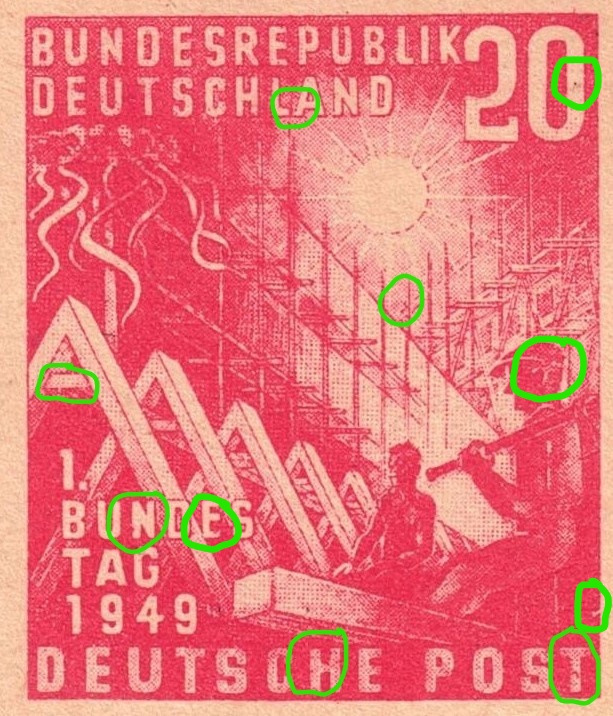 Kerbe im Rahmen rechts, roter Strich im T von POST - Mittelstrich H von DEUTSCHE unregelmäßig