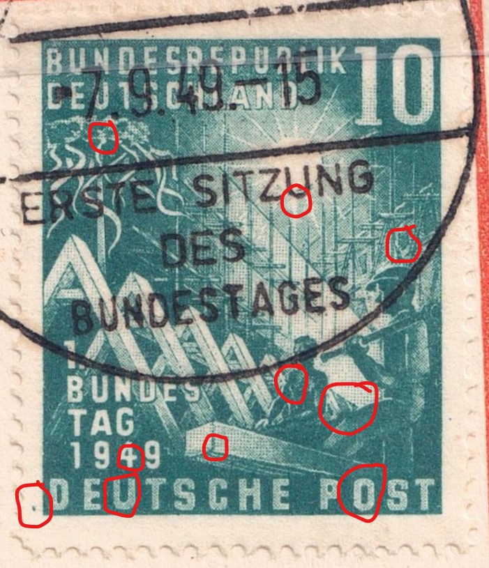 Kerbe im Rahmen rechts, roter Strich im T von POST - Mittelstrich H von DEUTSCHE unregelmäßig