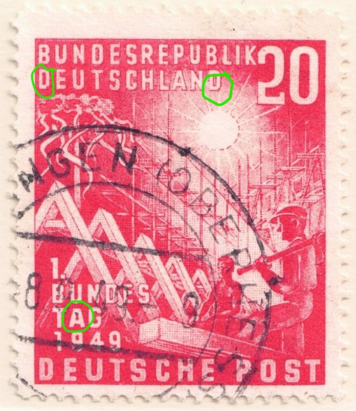 Die Bund 111 aus Beitrag 330 passt aber auch hervorragend zu den gezeigten mit weißem Punkt oben an Faust rechter Arbeiter mit innen defekten O von POST.