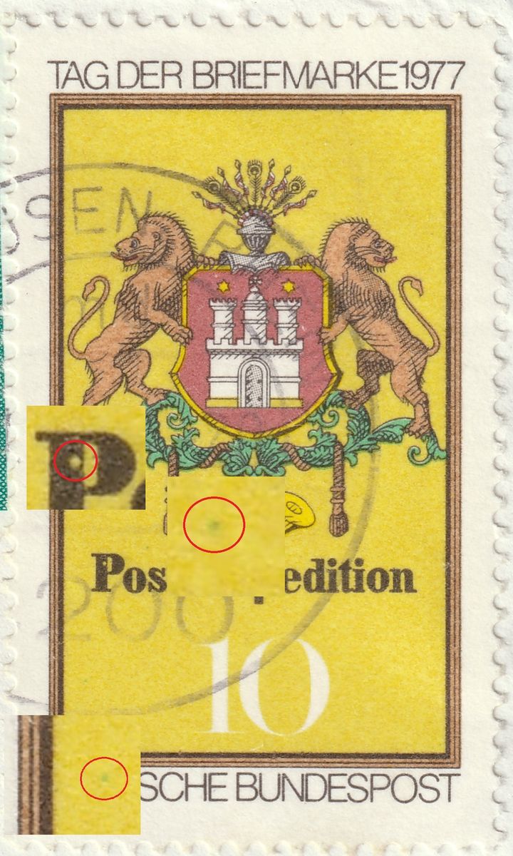 Erst nach dem hochauflösenden Scannen ist mir aufgefallen, dass neben dem dunklen und blauen Punkt auch ein gelber Punkt vorhanden ist. Da hier ein Kleinbogen vorliegt, kann ich auch das Bogenfeld 6 nennen, das die Abweichung enthält.