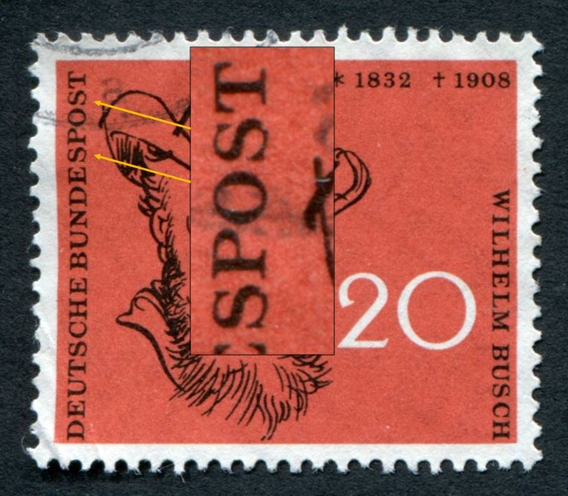 heute zeige ich angeknabberte Buchstaben bei der Wilhelm-Busch-Marke (MiNr 282):