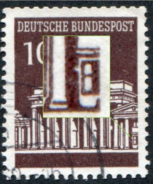 nun geht es weiter mit der Rollenmarken-Serie Brandenburger Tor. Auf der 10er (MiNr 506) fand ich eine Kerbe im Schatten der Säule ganz rechts (neben Fenster):
