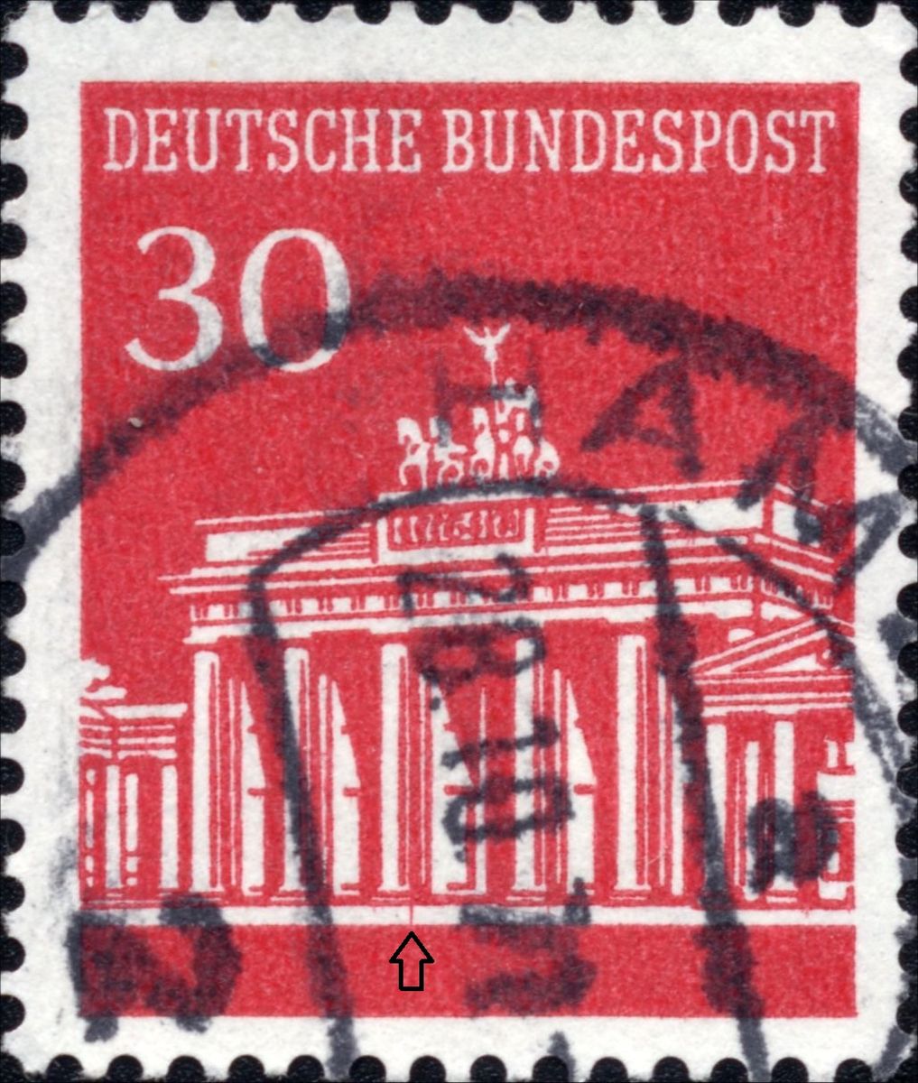 ich habe doch noch eine Druckabweichung der Serie "Brandenburger Tor". Bei der 100er (MiNr 510) ist mir ein Defekt aufgefallen, den man leicht übersehen kann, vor allem, weil auch recht viel vom Stempel in der Nähe ist.